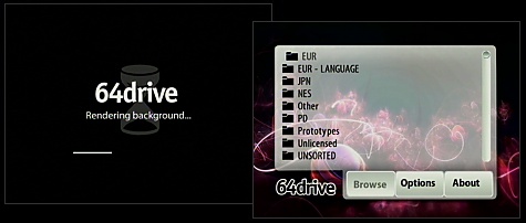 For those who wish to personalize the 64drive menu a little, one of the newer options, from Menu version 1.01, is to change the background skin. Simply create a 640x480px JPEG file and copy it to the root of the memory card you're using and the 64drive will merge it into the menu on the next boot. This background skinning is a little slow when the skinning happens, but once it's added the 64drive will boot as normal.