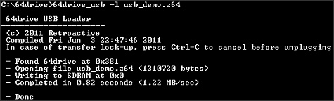 The firmware and bootloader is uploaded to the 64drive by using an USB Loader program which is supplied by Retroactive. Unfortunately the program, at this point, is a command line utility which means that it may be hard to use for the unexperienced.