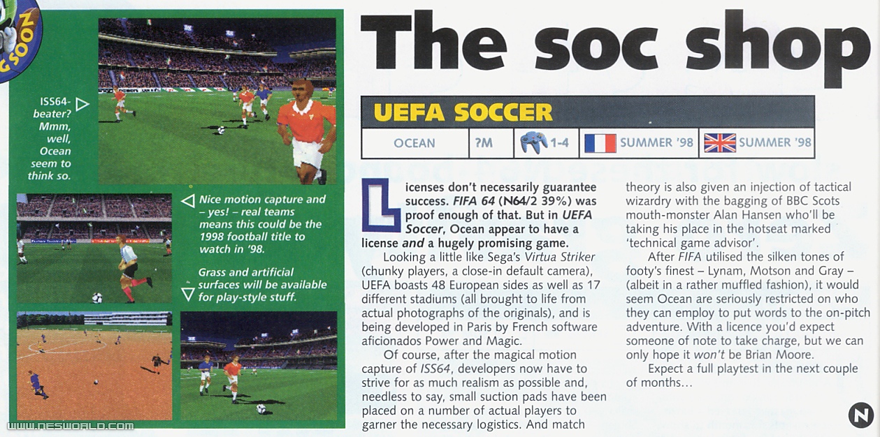character animation, texture-mapped polygon characters and fully 3D rendered stadiums. Ocean is confident that the game will be a "genre-defining product" and surpass any other N64 soccer title with