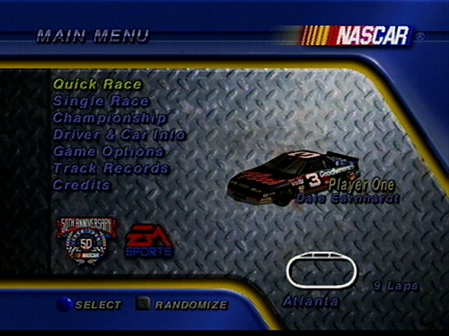 | Regional Title | NASCAR '99 | | Publisher | Electronic Arts | | Developer | Electronic Arts | | Release Date | | | GamePak ID | N9CE | | GamePak Region ID | USA |  | United States of America | | CIC Lockout Type | | | PCB Type | | | ROM Size | 96 Mbit | | ROM Revision | 1.0 | | Game Type | Racing | | Game Language | | | Players | 1 - 2 | | Multiplayer Mode | Simultaneously |